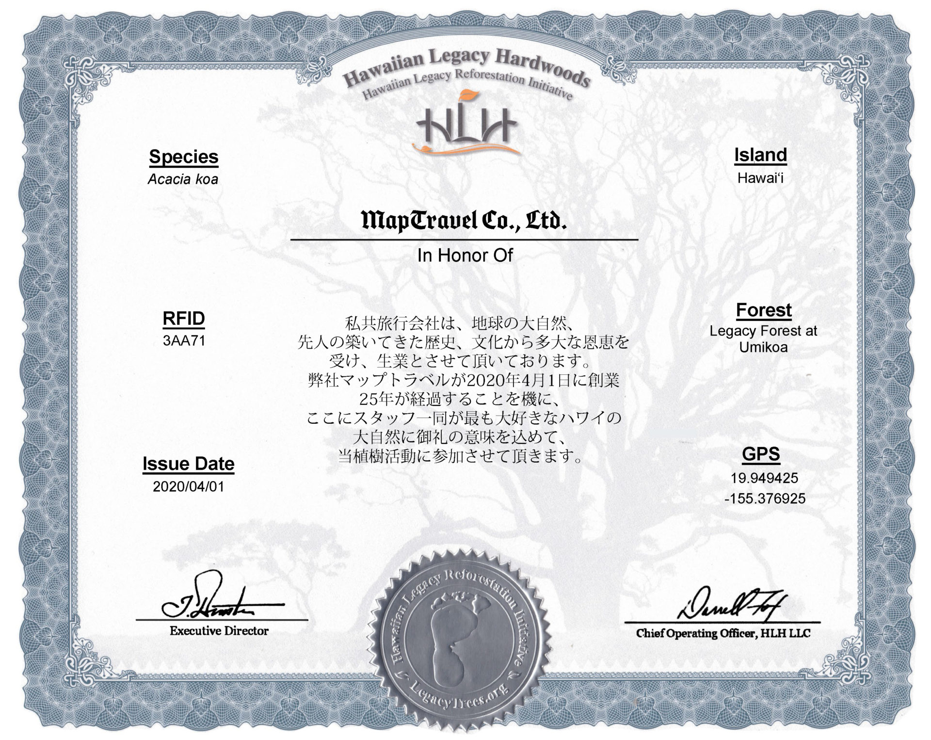 マップトラベルでは、 ハワイ州観光局認定サテライトオフィスであることからも、社員一同が大好きなハワイの自然環境保護を目的に、「 ハワイ島へのコナの木の植樹」を行いました。