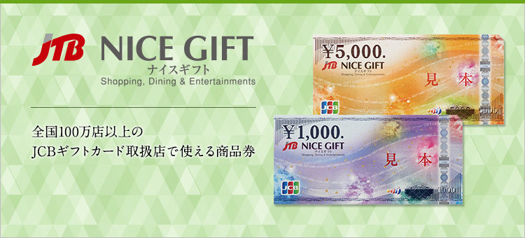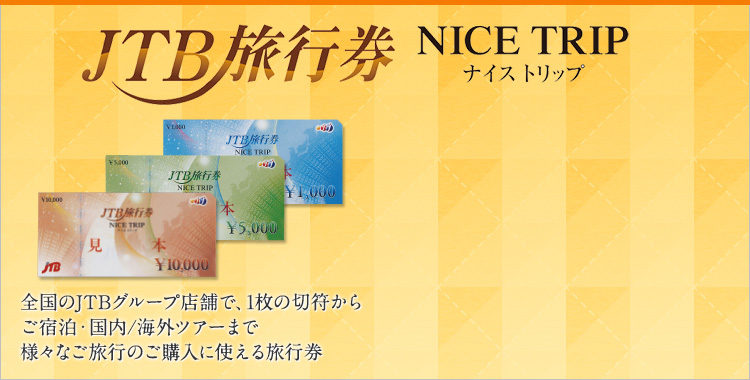 JTBの発行する商品券「JTBナイスギフト」のご購入、旅行券「JTB旅行券」をご購入・ご利用可能です。こちらは店頭にて熨斗、ラッピング対応したものをお渡しすること、営業担当にてお届けすることが可能です。永年勤続表彰や、大切な方への贈り物、景品用途としてご活用頂いております。