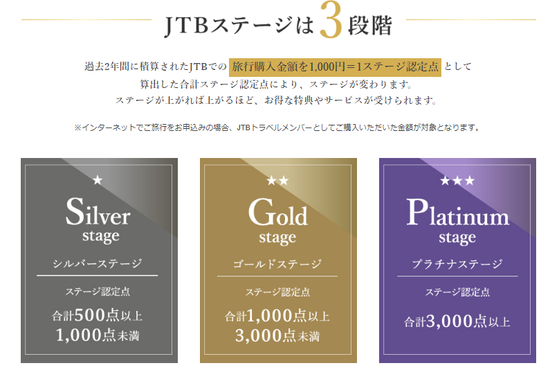 JTBトラベルメンバー制度にて、JTBでの旅行購入金額に応じた「JTBステージ」を認定。ステージに応じた優待を各種ご用意しています。