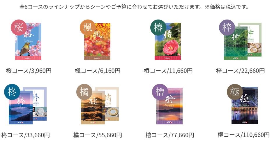 桜・楓・椿・梓・柊・橘・檜・極の全8コースのラインナップをご用意しておりますので、シーンやご予算に合わせてお選びいただけます。