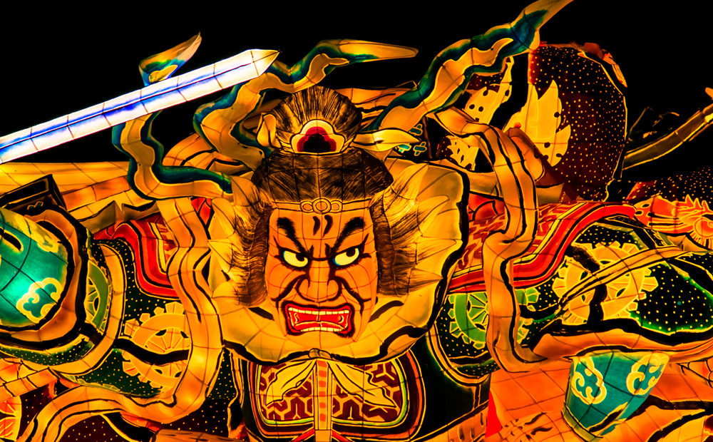 囃子に合わせ乱舞する跳ハネト人が歌舞伎の名場面や武者の巨大なねぶたと「ラッセーラー」の掛け声と共に賑やかに街を練り歩く伝統の祭りです。