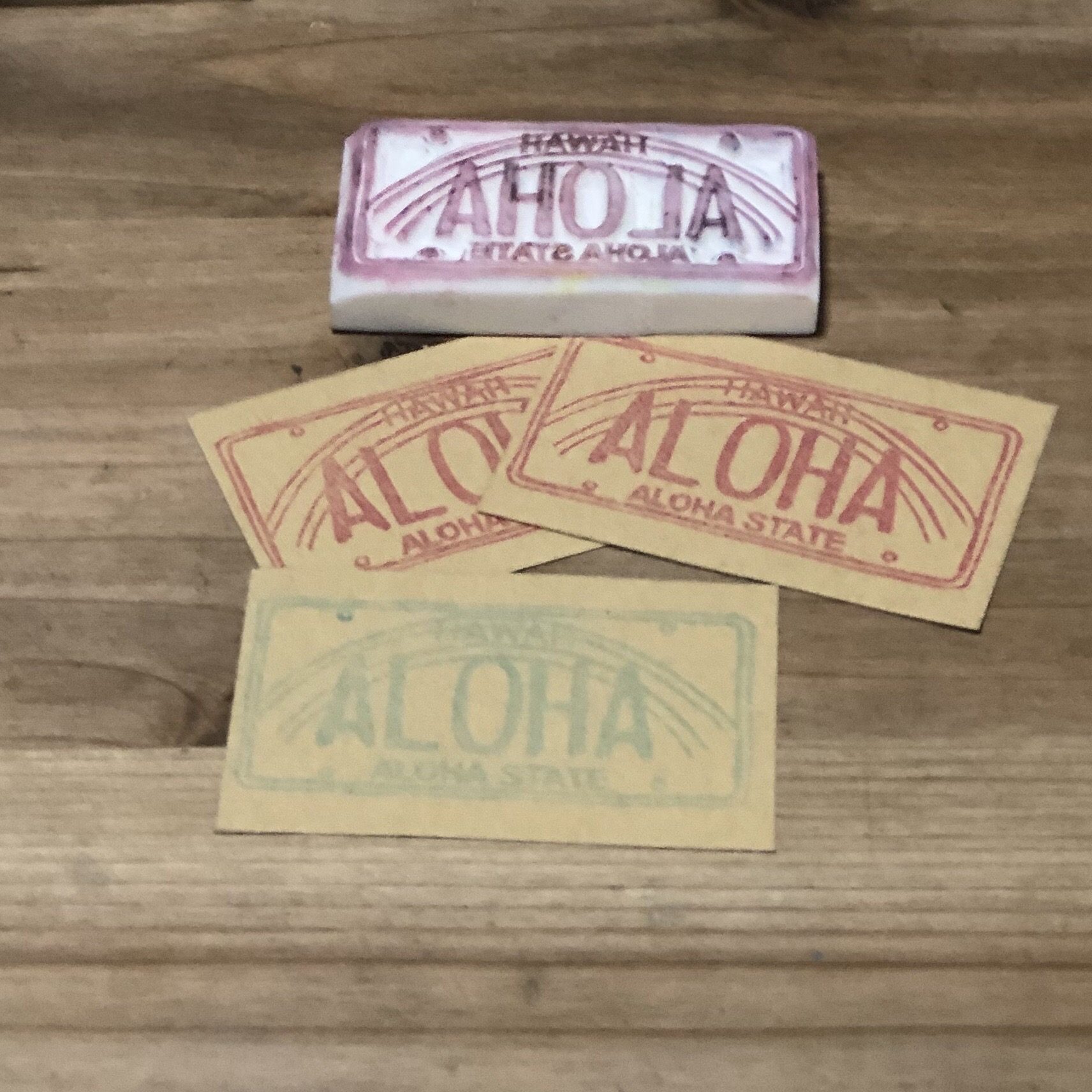消しゴム判子で作成したハワイのナンバープレート判子。このスタンプが押されたオリジナルステッカー付です。