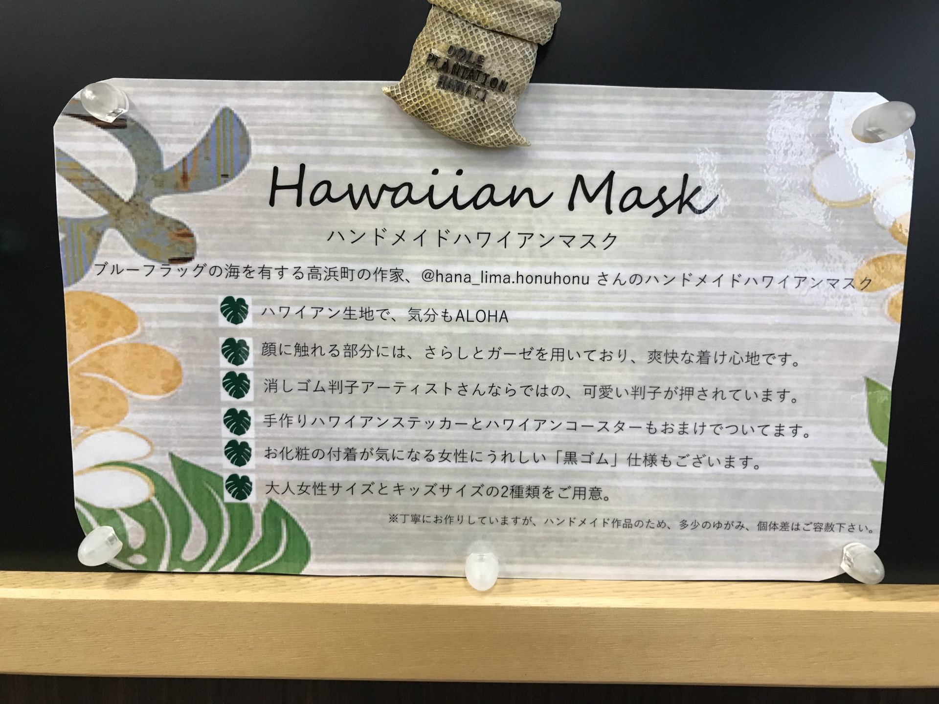 ハワイアン生地を用いたハンドメイドマスクをInstagramで良く見かけるのですが、なかなか私共の地元では見かけることがないなぁと思っていたところ、Instagramで見かけた高浜町の作家(@hana_lima.honuhonu )さんが制作されており、アプローチさせて頂き、快くマップトラベルにて販売して頂けることになりました。ありがたい話です。ご縁に感謝ですね。