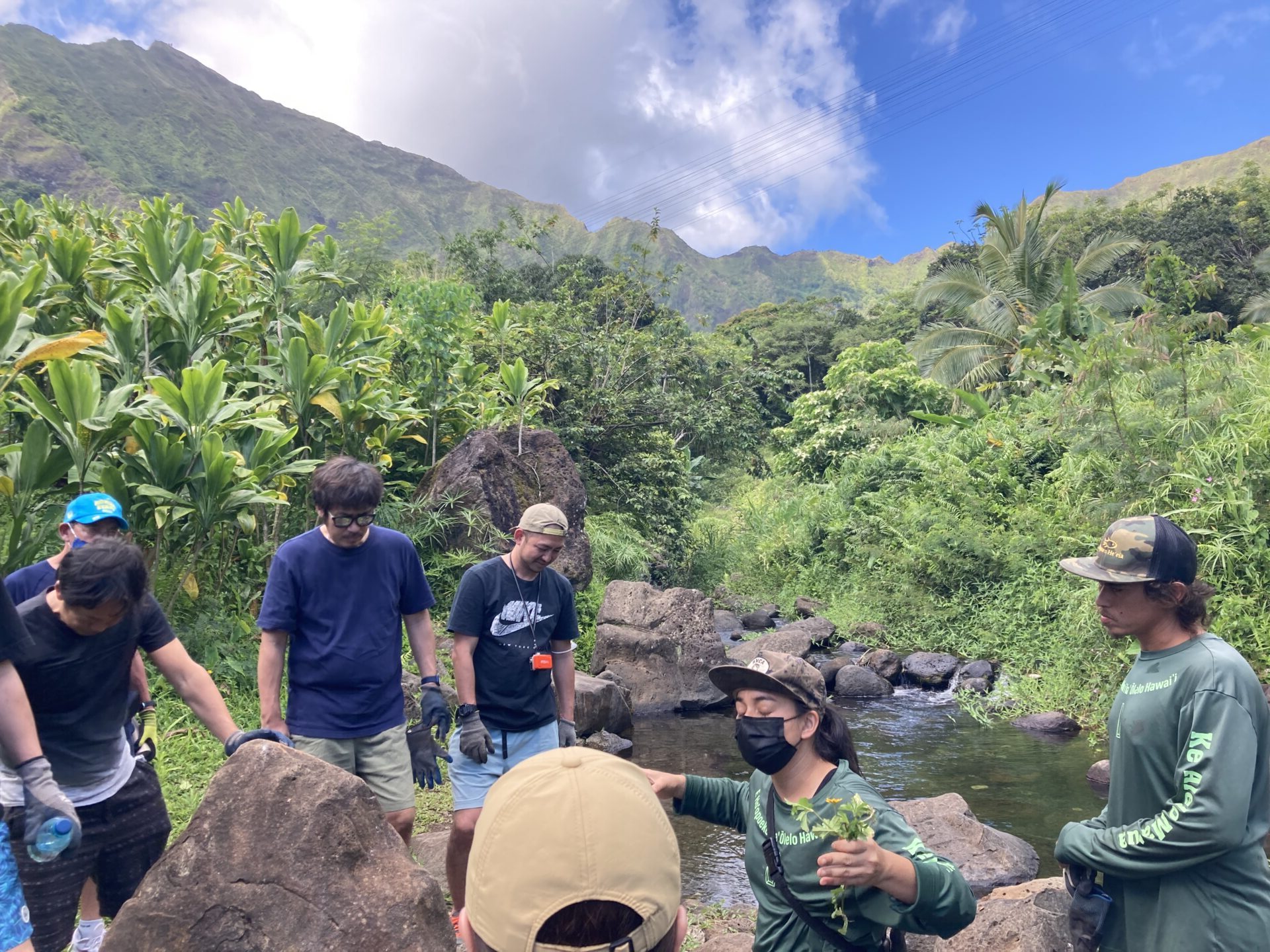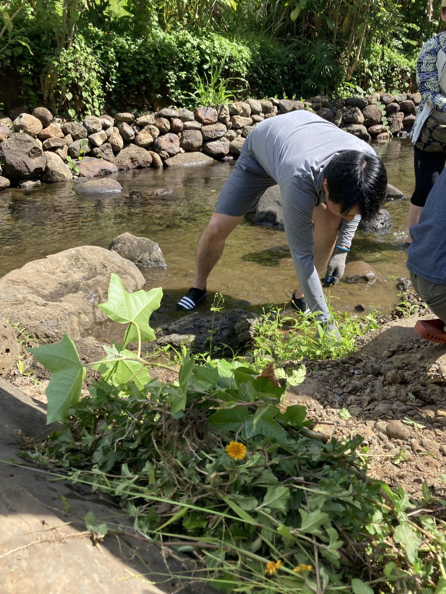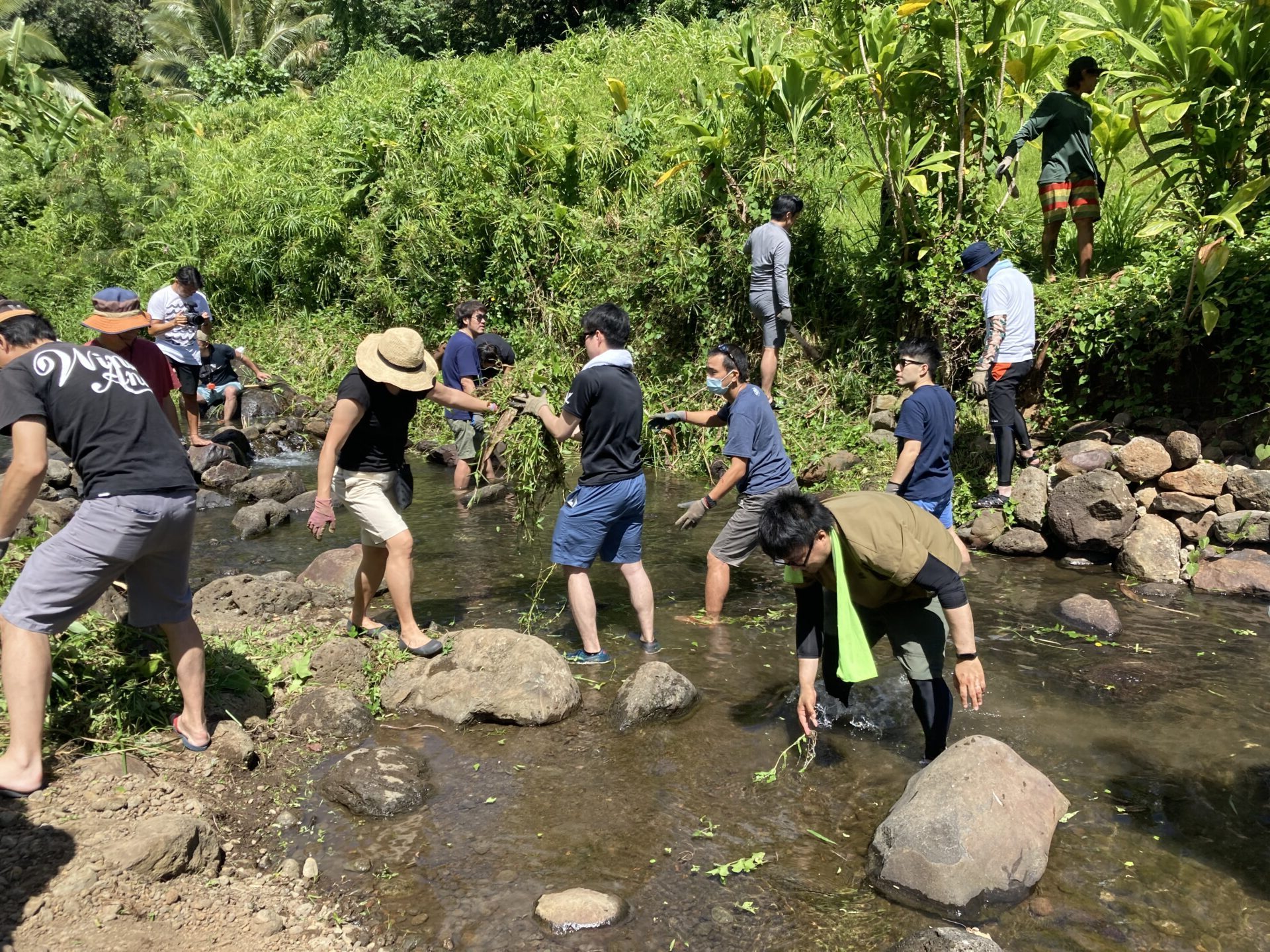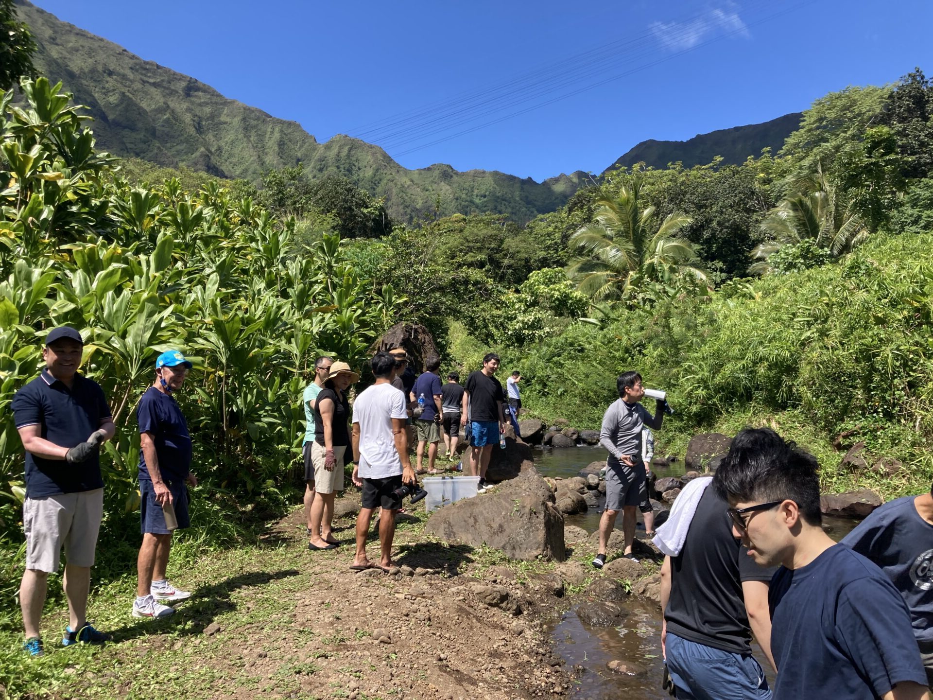 今回は2班編成に分かれて、私のいたAチームとBチームが最初に小川の外来種の植物伐採、Cチーム、Dチームがタロ畑の雑草伐採活動となり、それぞれテレコで実施しました。トイレも簡易ですがありますし、手を洗う場所も整備されております。