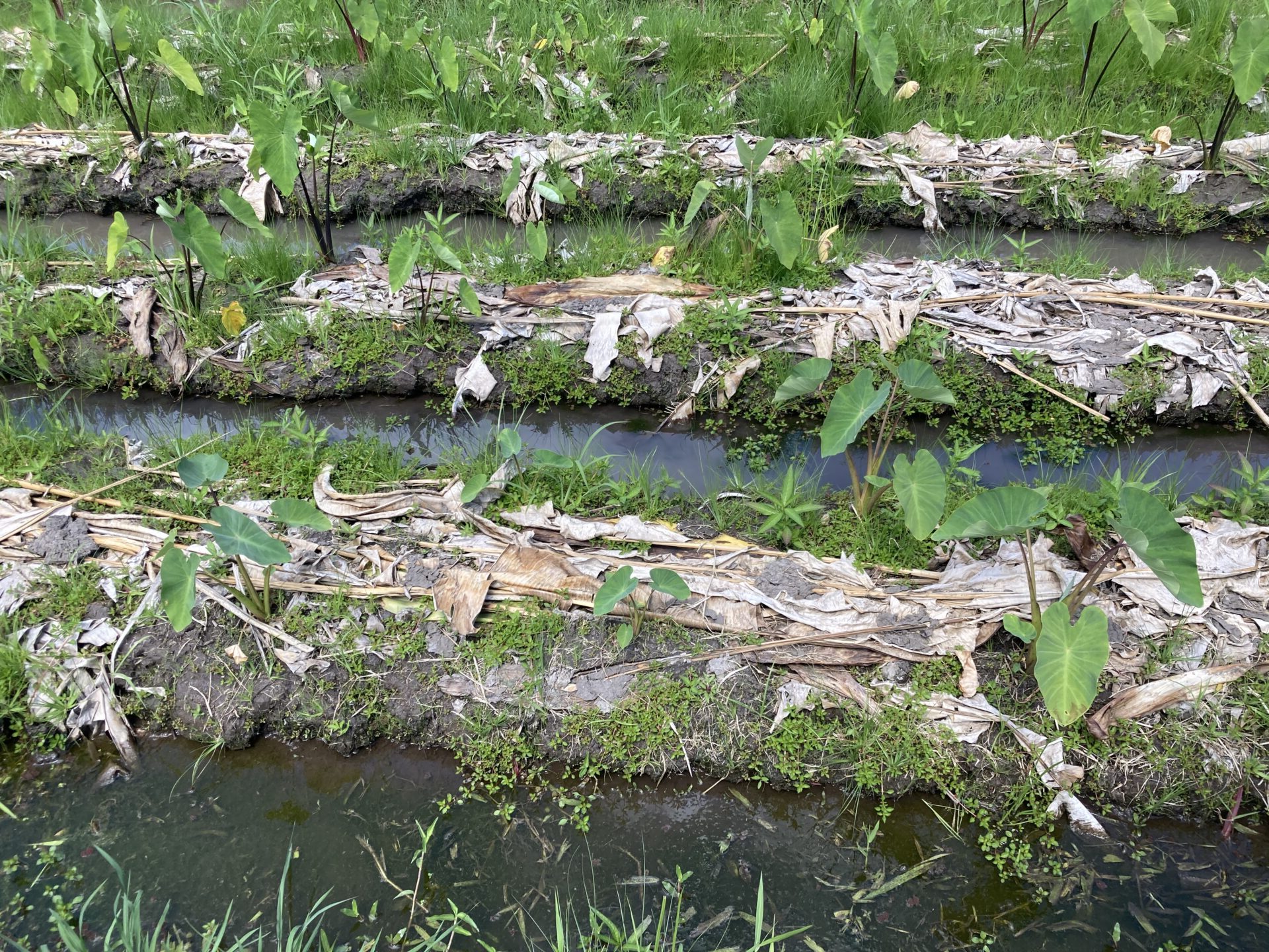 これがタロイモ畑。土壌は日本の田んぼのような粘度質の感触でした。タロイモの周りにある雑草を取り除く作業です。一列やったらまたいで前へ、の繰り返しです。