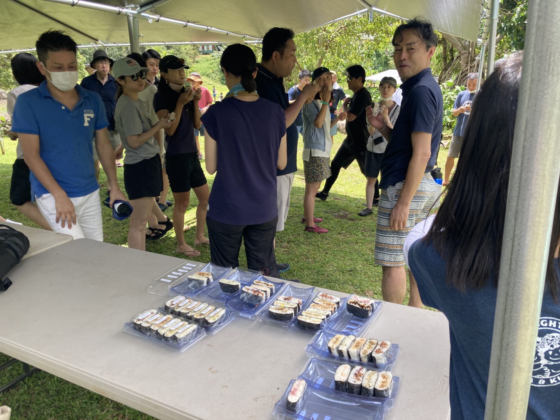 ボランティア活動が終わり、手も足も洗ったら、おむすびの差し入れがありました。こういう作業後の食事は150%増しでオイシイですね。