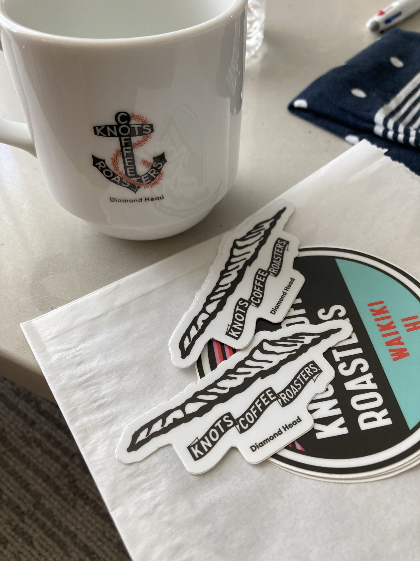戦利品のマグカップとステッカー。