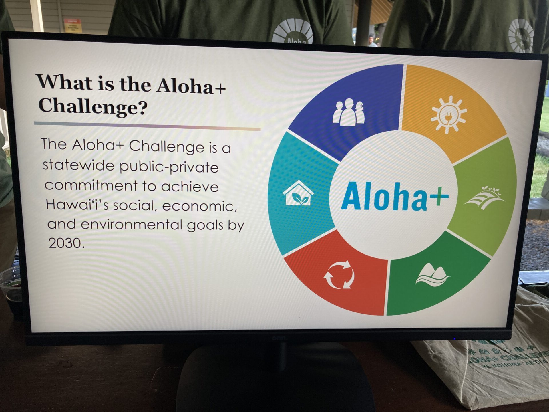 SDGsがうたわれる前からハワイでは独自に「Aloha+ Challenge」という活動が行われておりました。このブースでは、日本語堪能な若いスタッフさんとのやりとりで何か一つできることを宣言する、という内容でした。Tシャツやステッカーもいただき、プロモーションしてください、とのことでした。