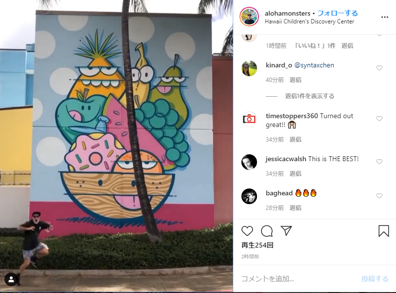 これは、新作だ!ってなりました。「アロハフルーツモンスター」。場所は、カカアコ地区にある、子供連れの滞在先にも人気な、チルドレンズ ディスカバリー センターの壁面かと思われます。これは、またカカアコ行ったら見ないとですね!