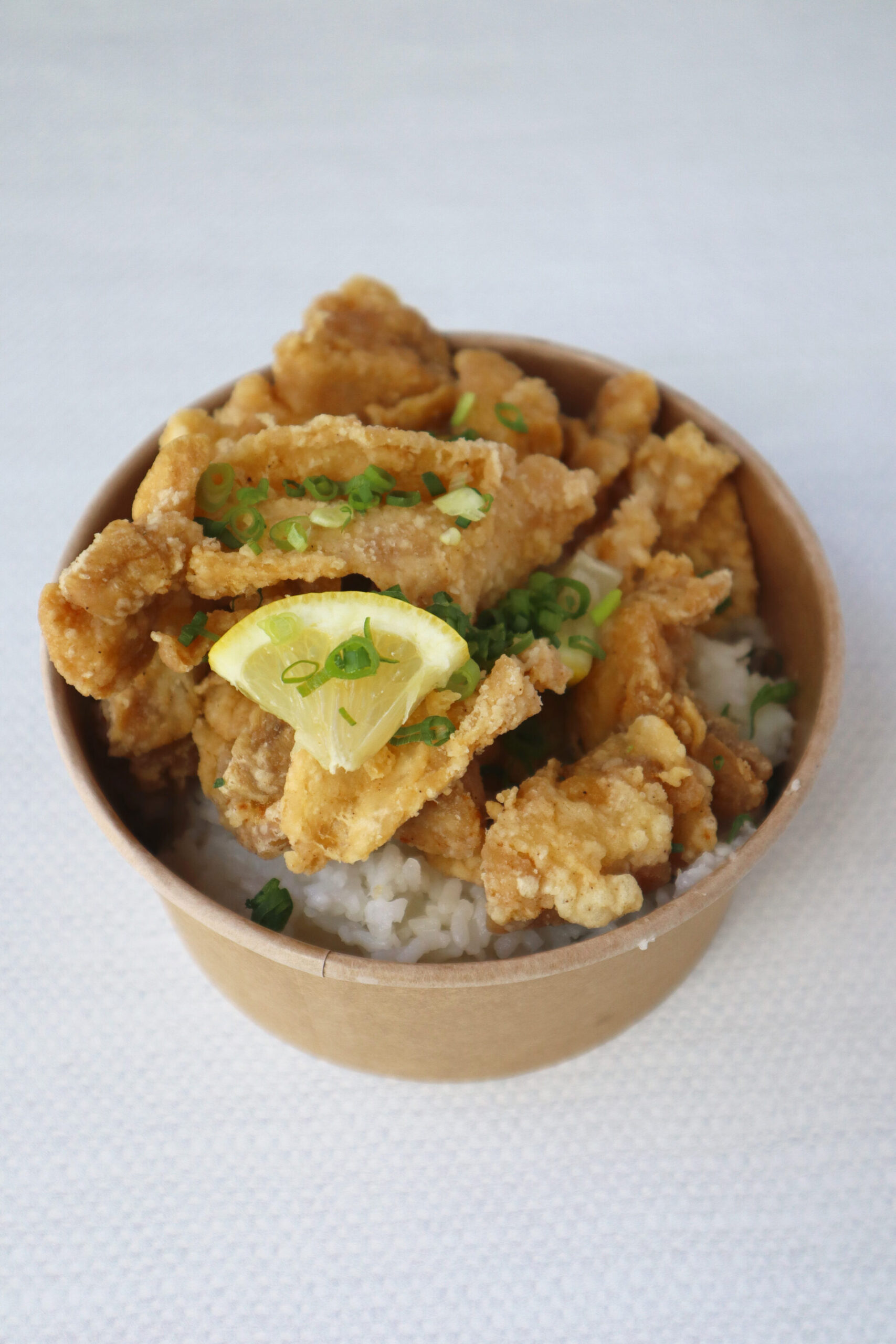 唐揚げチキン、ライス、レモンスライス、グリーンオニオントッピング