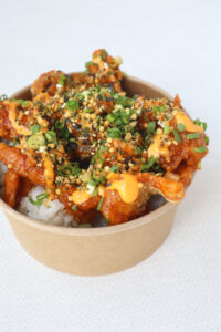 ハニーコチュジャン唐揚げチキン、ライス、シラチャマヨ、クランチー&グリーンオニオントッピング