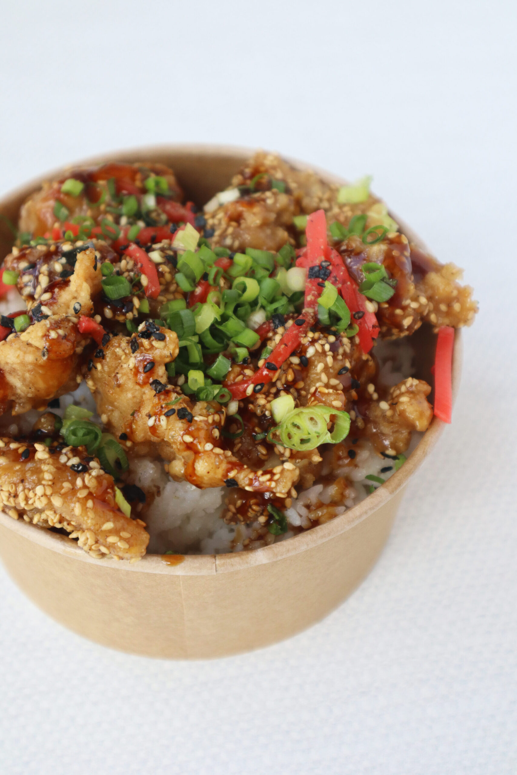 ローストセサミ唐揚げチキン、ライス、蒲焼きソース、ふりかけ、紅生姜、グリーンオニオントッピング