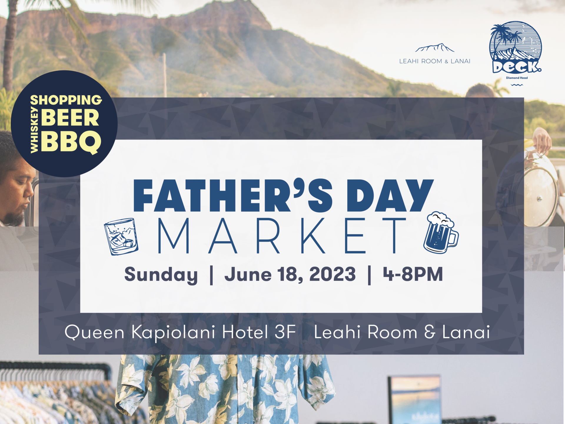 (ホノルル発)今年4月に初開催して大好評だったデックの「アルチザン・マルシェ」。今月は父の日でもある18日(日)の午後4時から8時まで、クイーンカピオラニホテル3階の人気レストラン「デック」に併設されているバンケット会場「レアヒルーム」とそのラナイにて、待望の第2弾「父の日マーケット」が開催される。サスティナビリティに心を配りながら運営している地元のビジネスと地域の架け橋になるべくスタートしたこのイベントは、世界中からデックを訪れる観光客にユニークなハワイのプロダクトを知っていただく絶好のチャンスでもあり、ローカルにとっては家族や友人たちと一緒に日曜日のひと時を過ごす良い機会。特に今回は、サンセットタイムの美しいダイヤモンドを眺めながらビールとウイスキーの試飲も楽しめるという、お父さんも大満足のマルシェとなる。