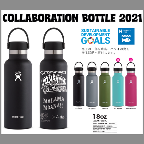 ①マップトラベルのハワイアンオンラインサイト「HENOHENO MAPPY」では、ハイドロフラスク12oz に本デザインを刻印したオリジナルボトルの先行予約を開始しております(発送は6月中旬ごろを予定)。ホットコーヒーの運用にぴったりの12 oz Flex Sipです。