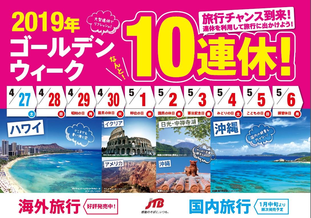 世間をにぎわしております、来年のGWにおける、10連休。JTBでもこんなPOPが生まれました。 なんか久しぶりに旅行業界における、よいニュースです。気分も上がりますね。 でもすごいですね。10連休って。ちょっとしたバカンスのような感じで。 10連休あればいけない所はない!またとないチャンスです。天皇陛下万歳です。本当に。 海外旅行はもう取り込み可能です。絶対混みますので、いい条件で、早めのご計画を立ててくださいね! \SHARE/FacebookLINETwitterTumblrPinterestいいね:いいね 読み込み中…