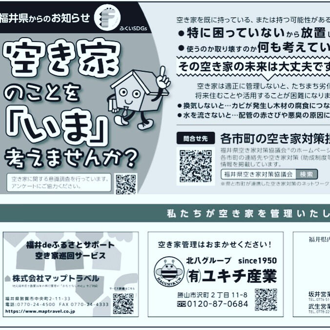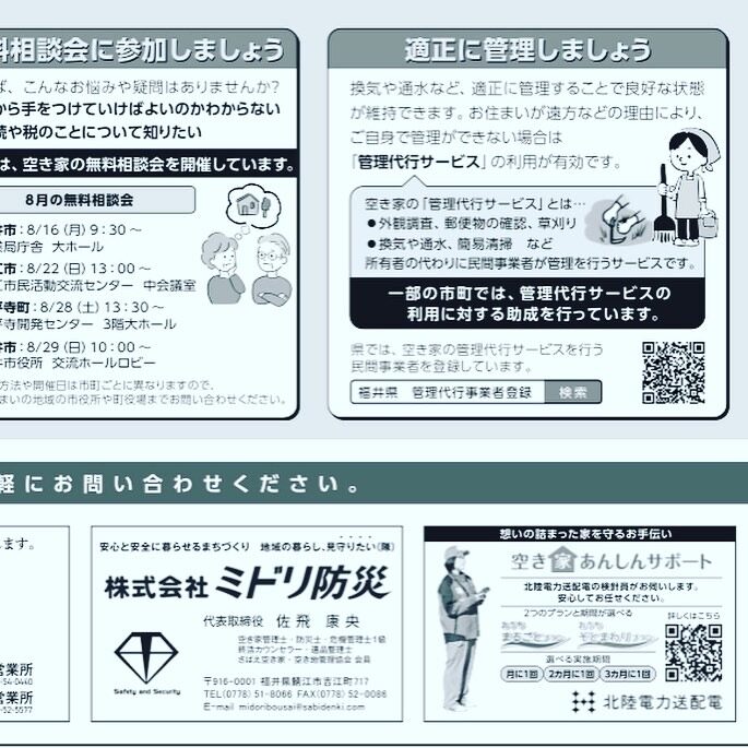 こちらは「福井県からのお知らせ」という記事の中で、空き家の管理の重要性、各市町の空き家対策担当連絡先、そして私共のような福井県に登録された空き家管理代行事業者の紹介の記事となります。