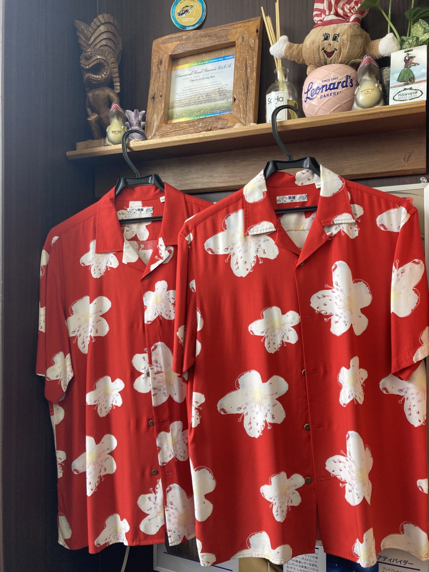 弊社のアロハシャツは、ハワイのアラモアナショッピングセンターのユニクロで購入したハワイ限定アロハシャツです!これを着てアロハな気分で皆様をお迎えします!