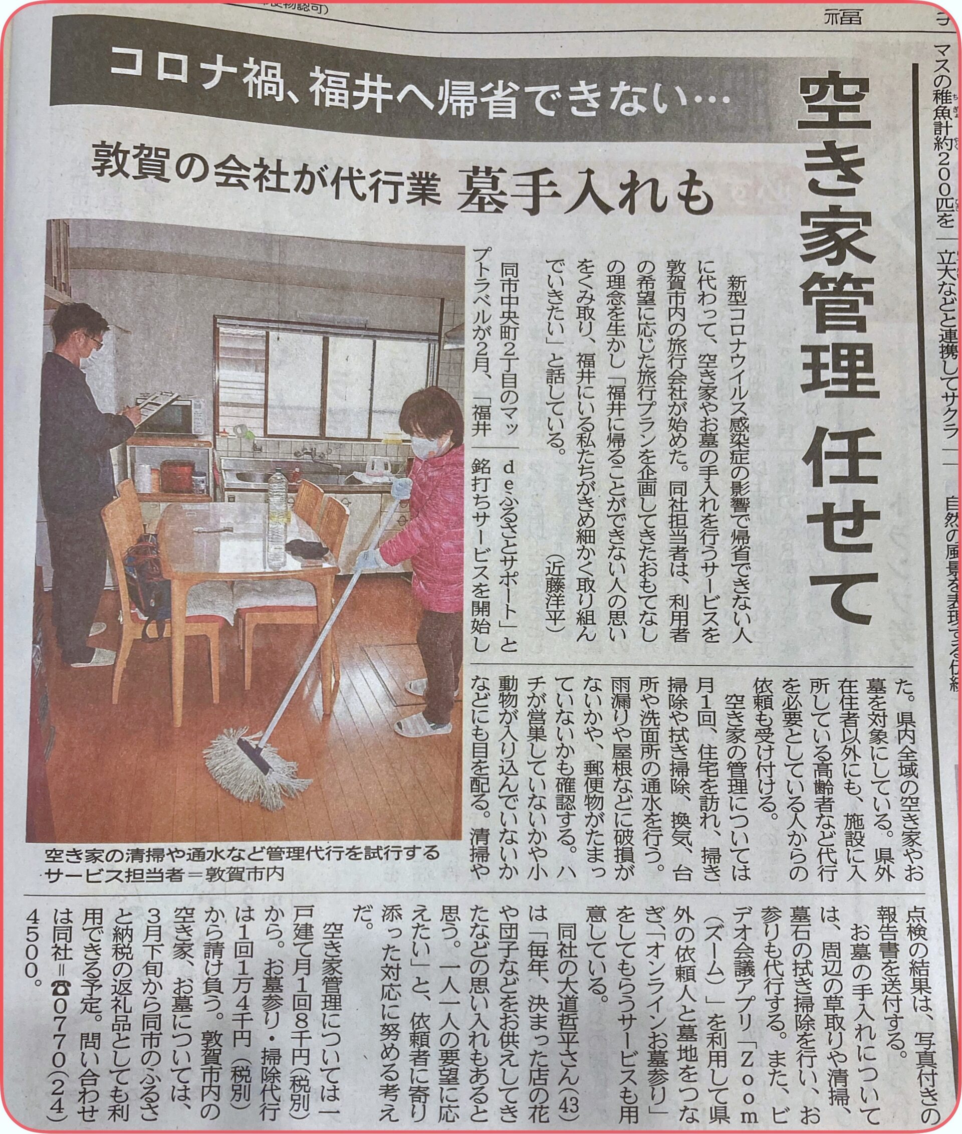 本日の福井新聞朝刊に、弊社新事業「福井deふるさとサポート(空き家巡回サービス/お墓参り・お墓掃除代行サービス)」の記事が掲載されました。福井新聞さん、いつもありがとうございます。