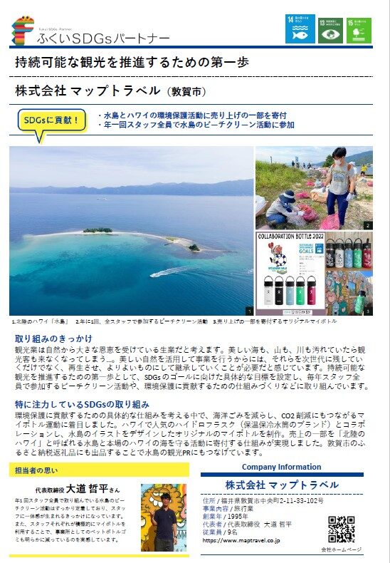 福井県が推進する「ふくいSDGsパートナー」。この度「ふくいSDGsパートナー」のマップトラベルのSDGsの取組が、福井県の事例集に掲載されました。皆様ぜひご覧ください。 本記事のpdf版はこちらから 今後も一過性ではなく、持続的に取り組みを続けてまいります。 JTB総合提携店/ハワイ州観光局認定サテライトオフィス 株式会社マップトラベル 〒914-0811 福井県敦賀市中央町2丁目11-33-102 センタービル1F TEL:0770-24-4500 営業時間:10:00-18:00(平日)10:00-17:00(土日祝) 定休日:水曜日 駐車場:6台 来店予約/オンライン相談予約はこちら 営業時間外の旅行のご予約はこちら ハワイアンオンラインストア『HENOHENO MAPPY』はこちら SUZURI:HENOHENO MAPPY 公式グッズオンラインストアはこちら HENOHENO MAPPY LINEスタンプはこちら 福井deふるさとサポートはこちら YouTube公式アカウント「マップトラベルTV」はこちら マップトラベルのCSR活動(SDGs:持続可能な開発目標)はこちら 日本結婚相談所連盟加盟の「婚活サポートOHANA」はこちら iPhone/iPad/Switch修理/iPhone買取はこちら 敦賀市でサステナブルな観光体験を!「サステナつるが」 \SHARE/FacebookLINETwitterTumblrPinterestいいね:いいね 読み込み中…