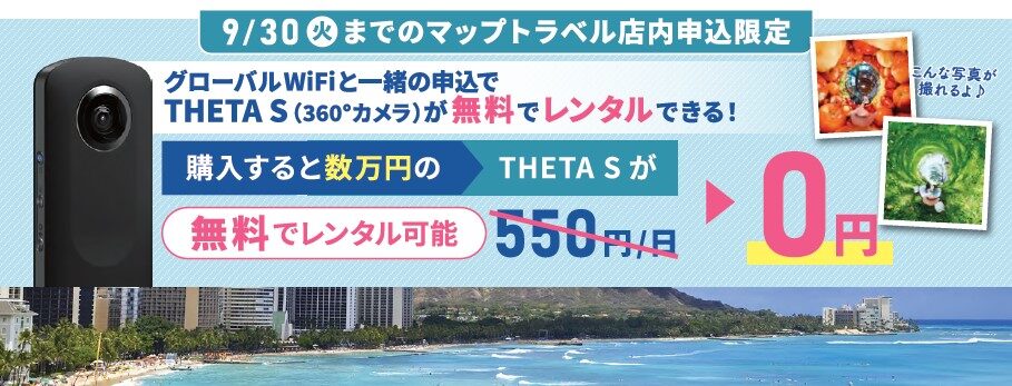 グローバルWiFiさんとのタイアップ企画です。旅行に行くなら、映える写真を撮りたいですよね? 2025年4月1日~2025年9月30日までのマップトラベル店内申込限定で、今なら360°カメラで話題の「THETA S」を無料でレンタルいたします。 これは旅がますます楽しくなりますね。私も早速次の海外旅行で申し込んで使ってみます! この機会にぜひマップトラベルへお越しください。 JTB総合提携店/ハワイ州観光局認定サテライトオフィス 株式会社マップトラベル 〒914-0811 福井県敦賀市中央町2丁目11-33-102 センタービル1F TEL:0770-24-4500 営業時間:10:00-18:00(平日)10:00-17:00(土日祝) 定休日:水曜日 駐車場:6台 来店予約/オンライン相談予約はこちら 営業時間外の旅行のご予約はこちら ハワイアンオンラインストア『HENOHENO MAPPY』はこちら SUZURI:HENOHENO MAPPY 公式グッズオンラインストアはこちら HENOHENO MAPPY LINEスタンプはこちら 福井deふるさとサポートはこちら YouTube公式アカウント「マップトラベルTV」はこちら マップトラベルのCSR活動(SDGs:持続可能な開発目標)はこちら 日本結婚相談所連盟加盟の「婚活サポートOHANA」はこちら MIZUSHIMA BLUE 北陸のハワイ 福井県敦賀市発クラフトビール誕生 はこちら 敦賀市でサステナブルな観光体験を!「サステナつるが」 \SHARE/FacebookLINETwitterTumblrPinterestいいね:いいね 読み込み中…