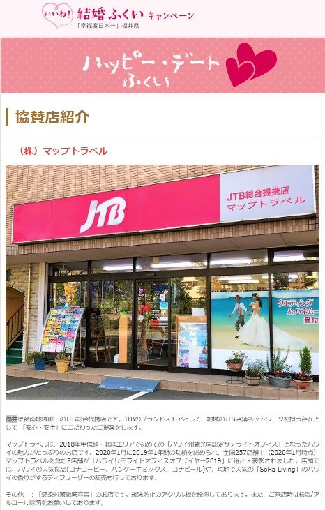 この度、マップトラベルは「ハッピー・デートふくい」の協賛店に参加しました。各地の協賛店に訪れて、HP画面を提示すれば、お得な特典が受けられます。スマホ片手に、ぜひ、ふたりでお出かけください♪