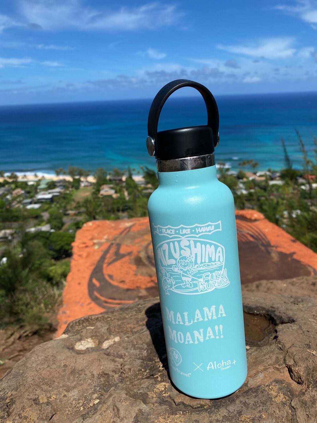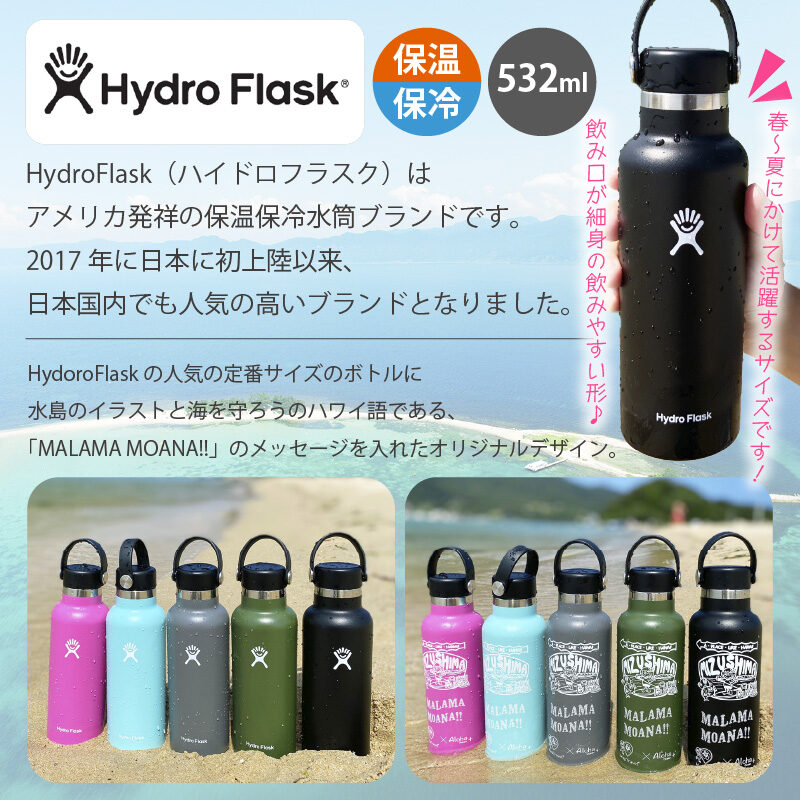 背面には、HydoroFlaskの人気の定番サイズのボトルに水島のイラストと海を守ろうのハワイ語である、「MALAMA MOANA!!」のメッセージを入れたオリジナルデザイン。