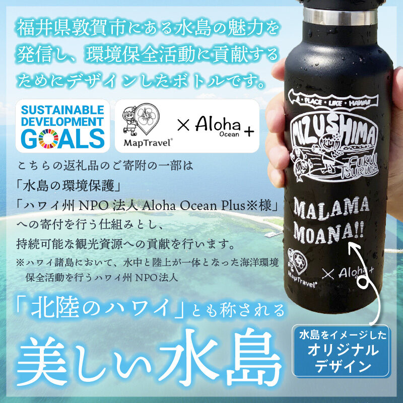 マップトラベルでは、かねてより取り組んでいる地元敦賀市にある「北陸のハワイ」水島の清掃活動、そしてハワイの海の清掃活動を行っているハワイ州NPO法人「Aloha Ocean Plus」さんへ売上の一部を寄付する「寄付型商品」として、この度、Hydro Flaskとマップトラベルのコラボレーションを企画し、この度発売開始となりました。