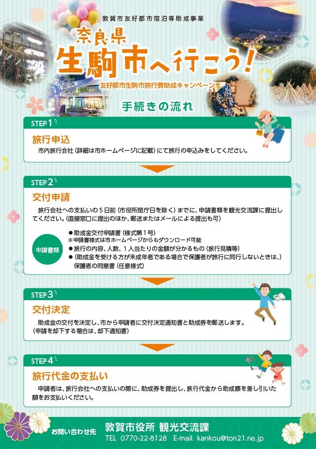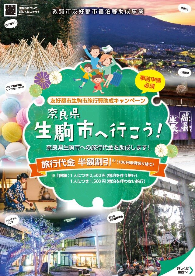 敦賀市HPに詳細の記載がある通り、事前に申請を行う必要がございますが、こんなお得なタイミングにぜひ友好都市生駒市を訪れてみませんか?
