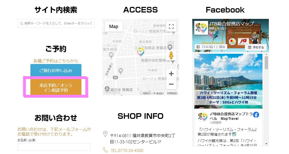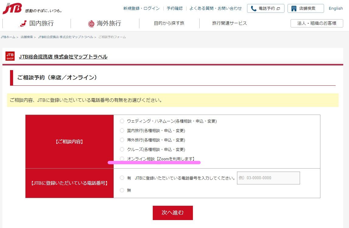 「オンライン相談」のご予約は、マップトラベルのHPの下記部分からお願いします。
