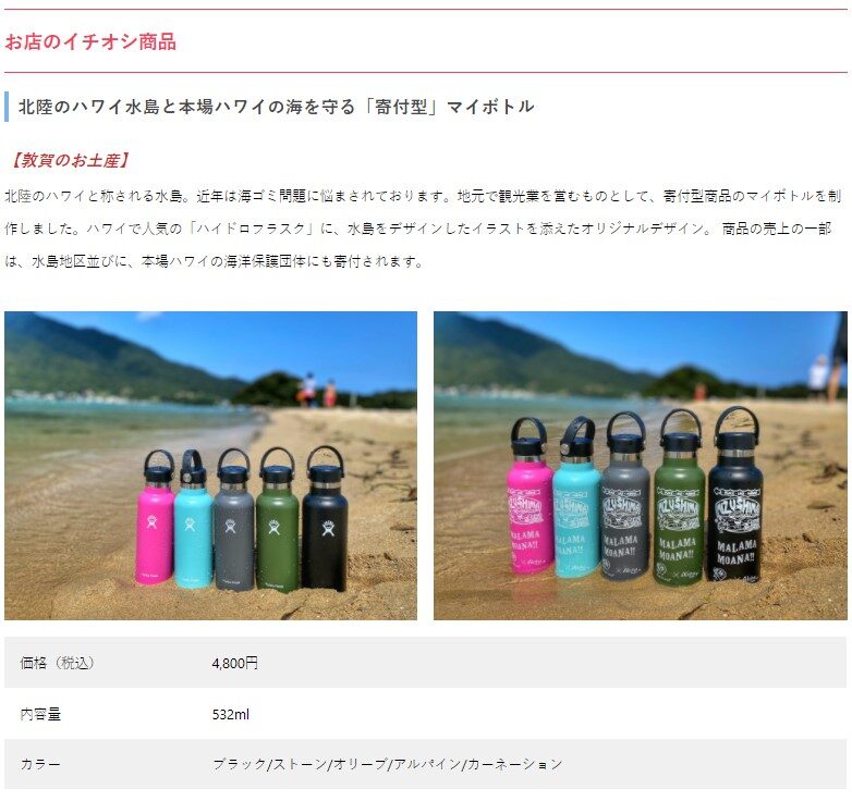 敦賀商工会議所の運営する敦賀のお土産を紹介するサイト「つるがのO・Mi・Ya【お土産】」に、マップトラベルの北陸のハワイ水島と本場ハワイの海を守る「寄付型」マイボトルが敦賀のお土産として掲載開始されました。