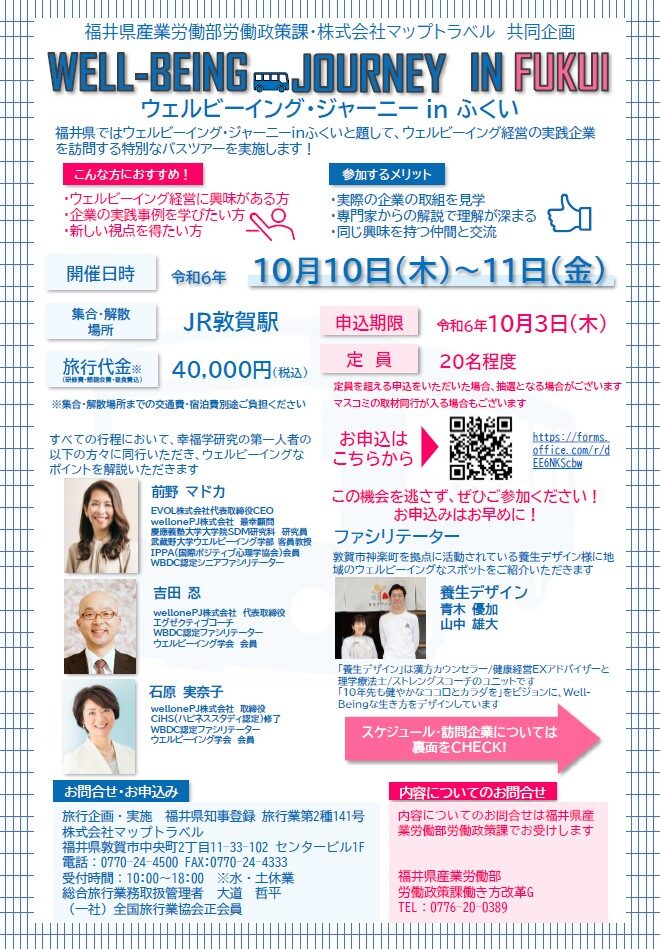 マップトラベルでは、福井県産業労働部労働政策課さんとの共同企画で本「ウェルビーイング・ジャーニーinふくい」のお問い合わせ・お申込みを承ります。