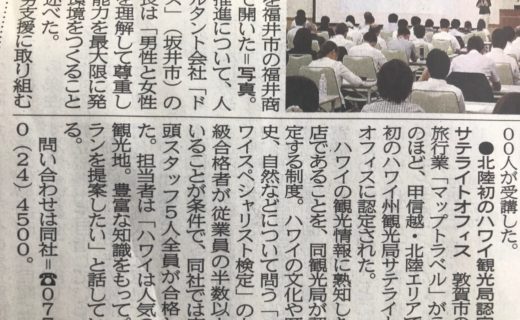 2018年8月3日(金)福井新聞朝刊に「北陸初のハワイ州観光局認定サテライトオフィス」として紹介され...