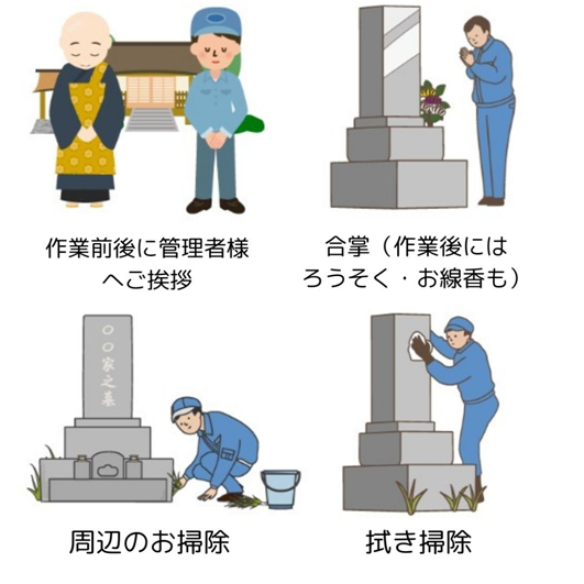 県外からなかなか帰省ができずにお困りの⽅、ご多忙でなかなかお墓のお⼿⼊れする時間がない⽅へ、皆様の代わりにお墓へ参り、お掃除を代⾏させていただきます。