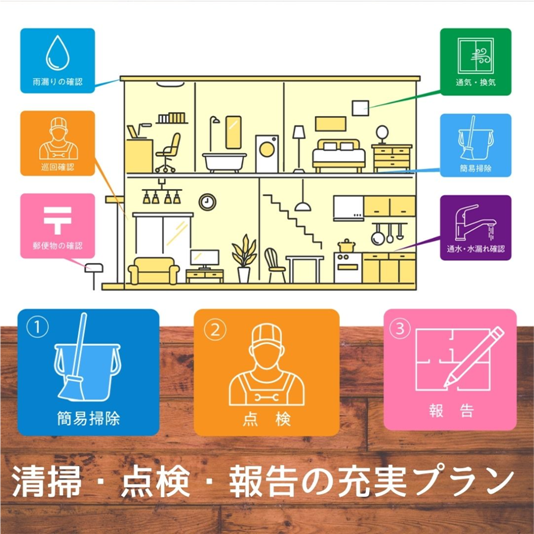 何らかの理由で「お住まい」を空き家にされる⽅々に⽉に1回、住居内を巡回し、通⽔・通気・換気・清掃などを私達が⾏います。清掃・点検後には、毎⽉⼀回現場写真付きの「作業報告書」をお送りさせていただきます。