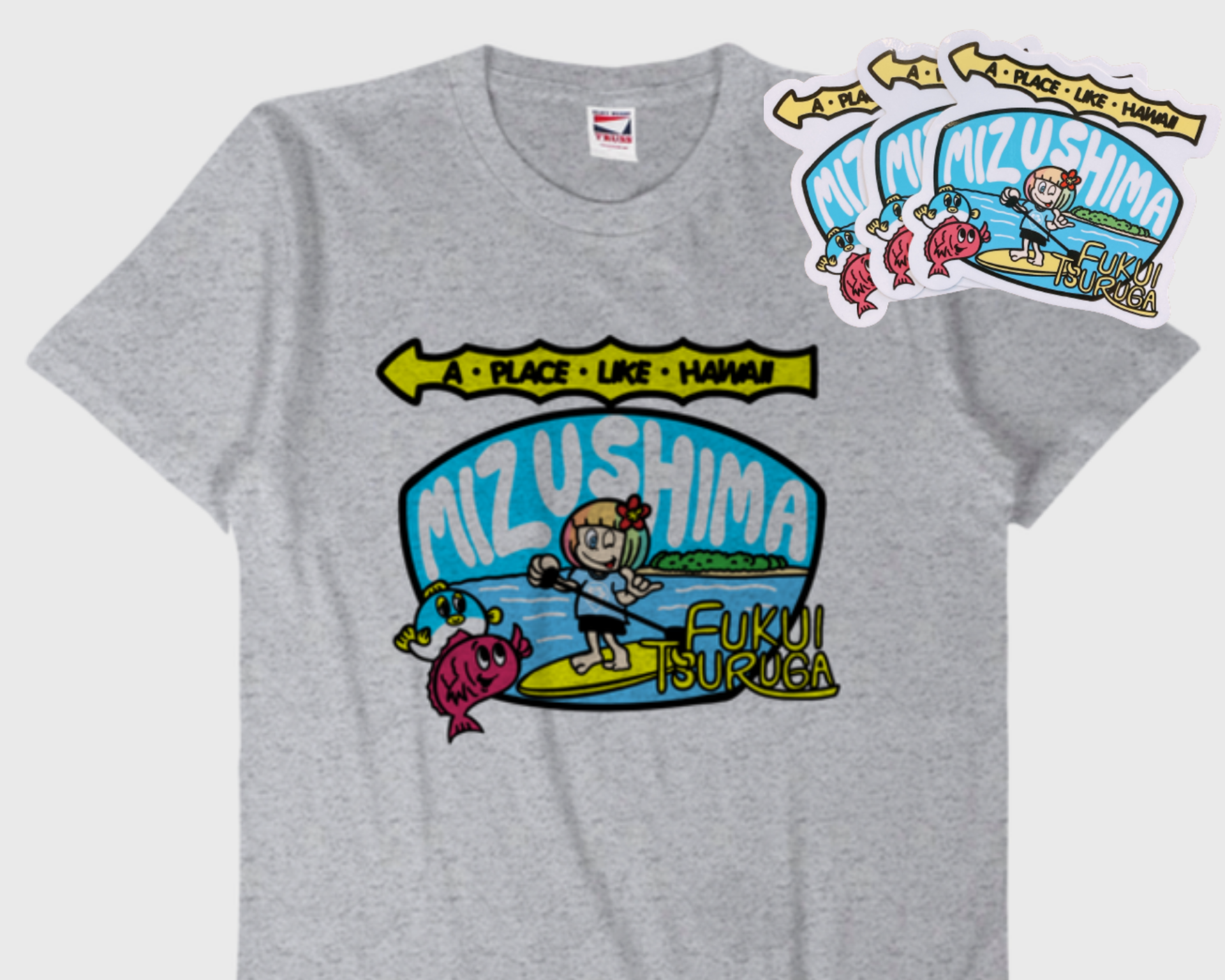 本デザインにて作成したステッカー・Tシャツをツアー参加者様へお土産としてプレゼントいたします。また、これらは敦賀の新たなご当地お土産として、市内やオンラインストアでの販売も開始致します。売り上げの一部は「水島の環境保護」、さらには「ハワイ州にある環境保護を目的としたNPO団体」への寄付を行う仕組みとし、持続可能な観光資源への貢献を行います。