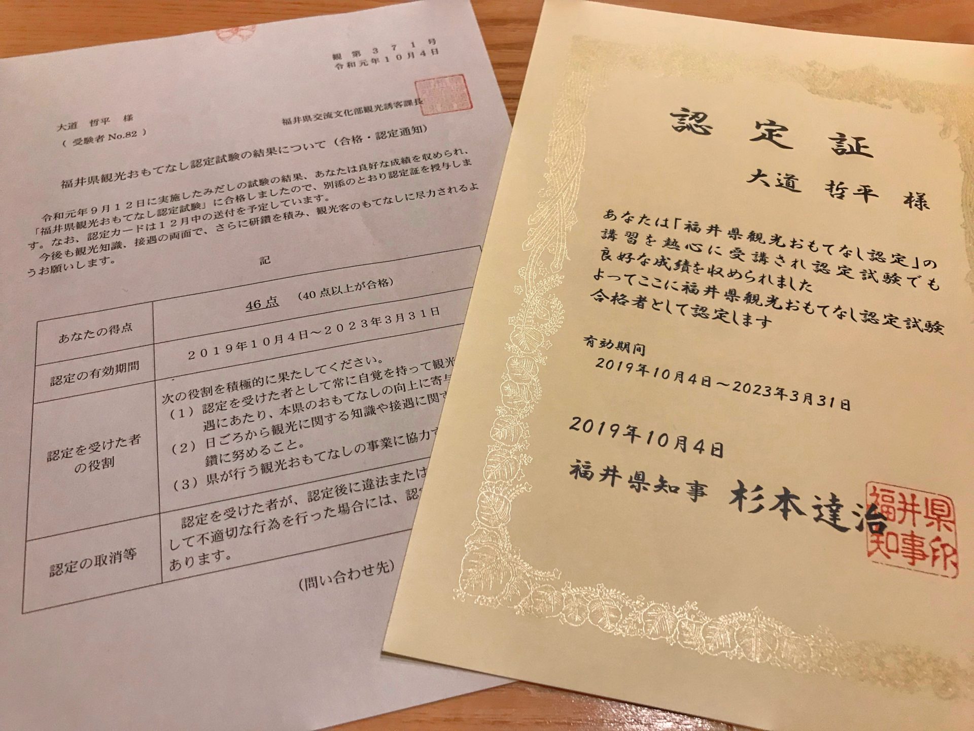 先日受験した「福井県観光おもてなし認定」。昨日福井県のHPに合格者発表が行われ、本日認定証が郵送されてきました。結果は、無事に合格しました。よっし!!