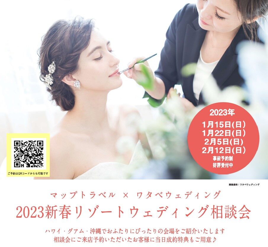 マップトラベルでは、来年早々に、毎年恒例の新春リゾートウエディング&ハネムーン相談会を開催いたします。