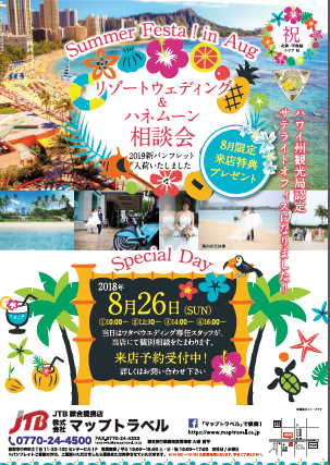 ハワイ州観光局認定 サテライトオフィス記念!! 来る2018年8月26日(日)、 ワタベウェディングさんと共同で ハネムーン相談会を実施します! ①10:00~ ②12:30~ ③14:00~ ④16:00~ 海外挙式のプロに直接相談できる機会はなかなかないですよ! 憧れのハワイで挙式を検討のお二人、事前ご予約の程お待ちしております!! \SHARE/FacebookLINETwitterTumblrPinterestいいね:いいね 読み込み中…